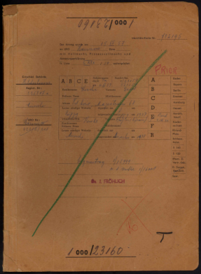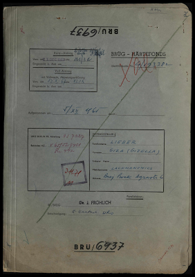 Lieber (née Lachmanowicz), Giza, residing in Bne Brak, Israel, reparations file.Giza Lieber, residing in Bnei Brak, Israel, sought restitution for precious metal items and jewelry belonging to her mother, Jente-Taube Lachmanowicz, who was forced into the Iza ghetto near Hust in mid-April 1944 and then deported to Auschwitz in late May 1944, where she perished. The applicant's brother, Izchak Lachmanowicz, was deported from Maidan to Auschwitz in 1944 and has been missing since. Her other brother, Pinchas Lachmanowicz, his wife, and their five children were deported from the Miskolc ghetto to Auschwitz in 1944, where they all perished. Giza's sister, Ruchel Zinn, her husband, and their seven children were deported from Maidan to the East in 1944 and perished during the deportation. During these events, Giza Lieber was in Budapest and has her own application for harm to her freedom suffered. She immigrated to Israel on August 21, 1950. The United Restitution Organization (URO) offices in Tel Aviv and Berlin handled her case, which resulted in a hardship compensation (Härteausgleich) of 850 DM under § 44a of the Federal Restitution Act (BRüG) for her mother's losses.