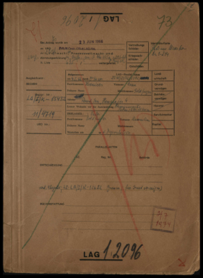 Käte Wachsner residing in Ramot HaShavim, Israel, sought compensation for harm to health suffered and harm to profession suffered during the Nazi era. Her suffering began after her husband Kurt Wachsner, was arrested during Kristallnacht in November 1938 and deported to the Buchenwald concentration camp, forcing the family to emigrate to Chile in June 1939. Following Käte Wachsner's death on June 9, 1962, her husband Kurt Wachsner, continued the compensation claims as her sole heir. Käte Wachsner's mother, Clara Pommer, and her only brother were murdered by the Nazis in the Netherlands. Before the Nazi era, Käte Wachsner lived in Breslau and worked as her husband's medical assistant from 1933 onwards. The family lived in Chile until 1954, when they immigrated to Israel. For the harm to health claim, a court settlement on January 20, 1964, awarded a pension back payment of DM 29,879 and a capital compensation of DM 21,922.21. For the harm to profession claim, a settlement of DM 4,500 was reached on April 26, 1965. The United Restitution Organization (URO) offices in Tel Aviv and Frankfurt am Main were involved in the case.