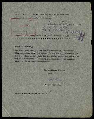 Levi, Magdalene Julie, residing in Kfar Saba, Israel, reparations file.Magdalene Julie Levi, a resident of Kfar Saba, Israel, sought compensation for loss of her income and financial harm (Kapitalentschädiging) and related pension and other damages incurred during the Nazi era. A former social worker (Fürsorgerin) for the City of Frankfurt am Main, she was dismissed from her position in November 1933. Following her dismissal, she worked at the Jewish Lehrhaus in Frankfurt from December 1933 until October 1937. In March 1938, she emigrated to Palestine, during which she was forced to pay punitive taxes (Reichsfluchtsteuer and Judenvermögensabgabe) and suffered monetary losses through a forced transfer (Transferverlust) and emigration expenses - being forced to sell her bank securities to assure those. File also mentions compensation sought for the forced sell of her household before leaving. For these damages to property and assets, she was awarded 10,143.37 DM in June 1955. Later, in April 1957, she received an additional 1,989.83 DM as compensation for her loss of income in public service from December 1933 to May 1945. The City of Frankfurt also granted her a pension and back payments for the period from June 1, 1945, onwards. Her case was handled by the United Restitution Organization (URO) offices in Tel Aviv and Frankfurt am Main.