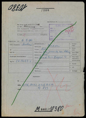 Bach, Sofie, residing in Haifa, Israel, reparations file.The Public Guardian of Israel filed a claim on behalf of Sofie Bach, an incapacitated person hospitalized in Ramatayim, Israel. The claim sought compensation for harm to liberty she suffered in her birthplace of Tecuci, Romania, where she was forced to wear the Jewish Star from July 1941 to August 1944 in the established Ghetto. She was born on February 27, 1908, immigrated to Israel on February 21, 1951, and was hospitalized for mental illness from May 26, 1954. A further claim was made for a hardship fund allowance due to her financial situation and poor health. The United Restitution Organization (URO) offices in Tel Aviv, Frankfurt, and Haifa were involved in the case. The compensation for harm to liberty was settled for DM 2,000 in 1969, and a hardship allowance under § 165 BEG was approved in 1970, consisting of a back payment of DM 500 and a monthly pension of DM 100. Sofie Bach passed away on July 19, 1974.